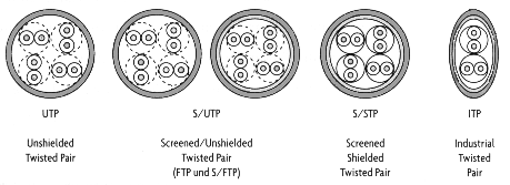 - S/UTP-Kabel (Screened/Unshielded Twisted Pair) haben einen Gesamtschirm aus einem Kupfergeflecht zur Reduktion der äußeren Störeinflüsse.